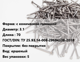 Гвоздь с конической головкой 3.1х70 ГОСТ: ТУ 25.93.14-008-29684338-2018 без покрытия ершеный 5
