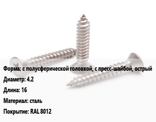 Саморез с полусферической головкой, с пресс-шайбой, острый D=4.2 L=16 сталь RAL 8012, кг, Phillips 2, Китай цена от 759.98 Тг / кг, где купить, условия доставки в Атырау и Атырауской области области