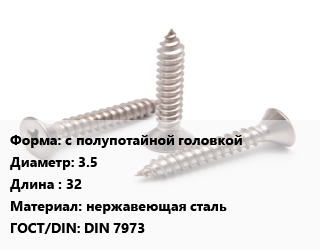 Саморез с полупотайной головкой D=3.5 L=32 нержавеющая сталь ГОСТ: DIN 7973