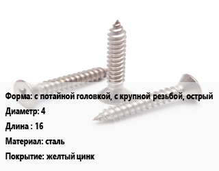 Саморез с потайной головкой, с крупной резьбой, острый D=4 L=16 сталь желтый цинк, шт цена По запросу где купить, условия доставки в Атырау и Атырауской области области