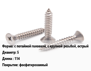 Саморез с потайной головкой, с крупной резьбой, острый D=5 L=114 фосфатированный