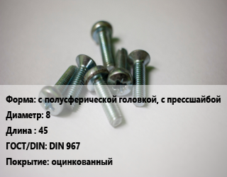 Винт с полусферической головкой, с прессшайбой 8х45 DIN 967 оцинкованный, упаковка, кг цена от 147.69 Тг / кг, где купить, условия доставки в Атырау и Атырауской области области