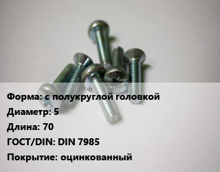 Винт с полукруглой головкой 5х70 DIN 7985 оцинкованный, цена за шт, кг цена от 2 236 Тг / кг, где купить, условия доставки в Атырау и Атырауской области области
