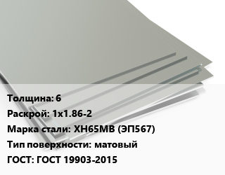 Лист нержавеющий 6 1х1.86-2 Сталь: ХН65МВ (ЭП567) Тип:матовый ГОСТ 19903-2015